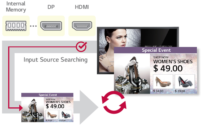 Функция аварийного переключения позволяет дисплею обнаруживать доступные входные сигналы и автоматически менять источник, когда текущий сигнал отключен или подключены другие сигналы с более высоким приоритетом.