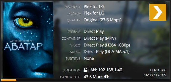Только вот это говорит в том числе и о том, что используется Plex-клиент на стороне ТВ и Plex-сервер. То есть как раз связка клиента в ТВ и сервера, на котором еще, между прочим, и профиль свой для LG ТВ есть, если кто не в курсе.