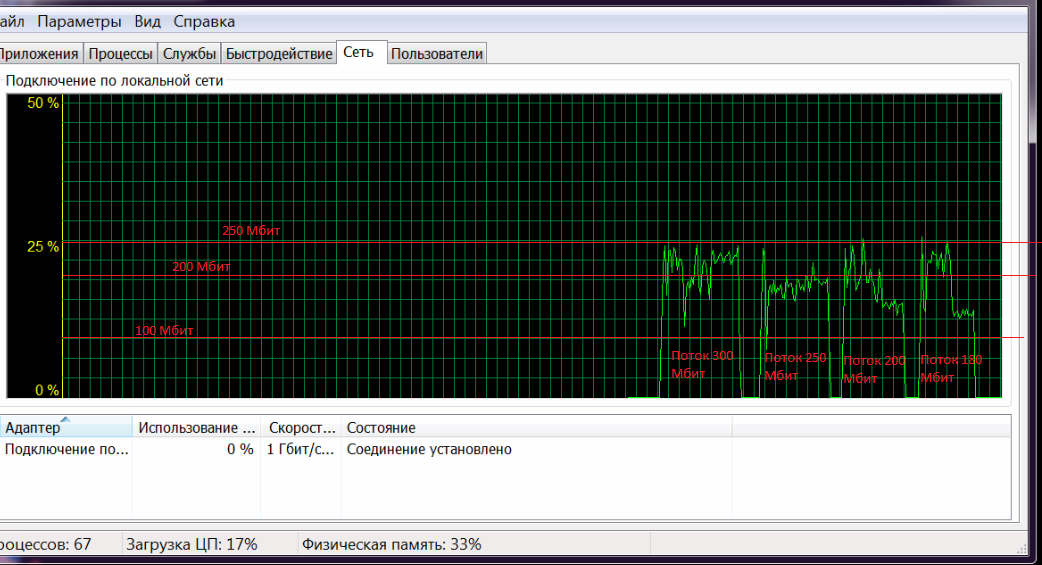 На рисунке показана загрузка сети ПК при включении файлов 300, 250, 200 и 180 Мбит. Как видно в пиковых значениях сеть грузится примерно одинаково для каждого файла. Предполагаю, что битрейт 200 Мбит и выше ТВ просто не способен обработать, отсюда и возникают фризы и равная, по сравнению с 180 Мбит, загрузка сети.