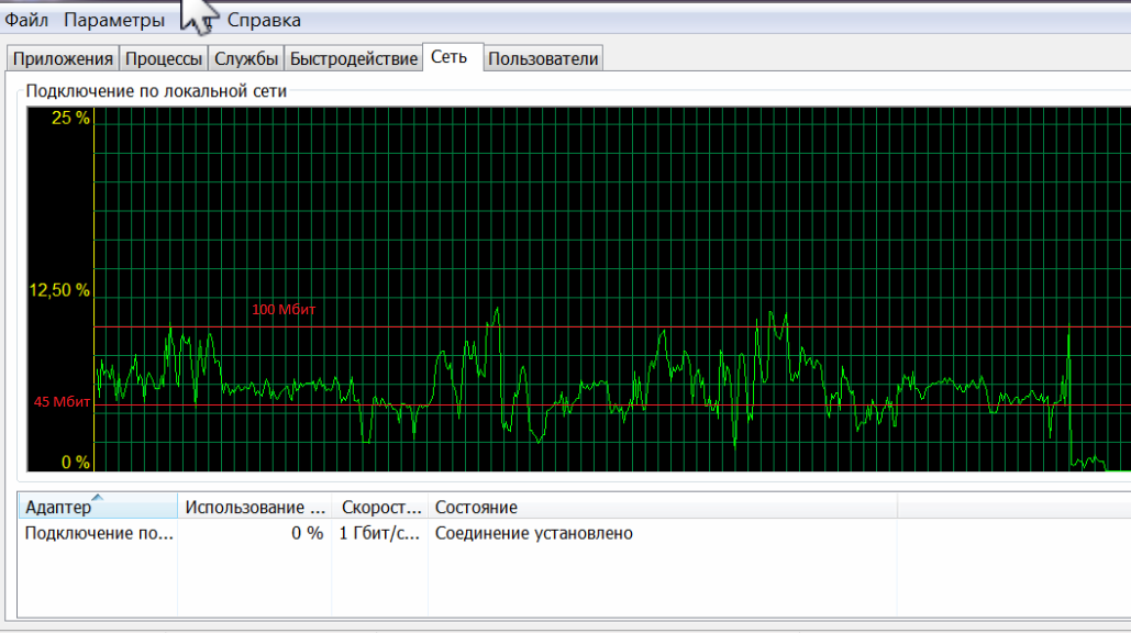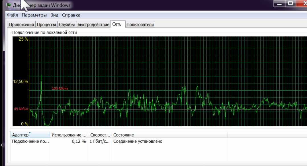 На картинах показана загрузка сети ПК при просмотре сериала в разные моменты времени. Как видно из картинок пиковые значения потока периодически превышают 100 Мбит, что обусловливает буферизацию на прошлом роутере (Zyxel Keenetic Lite III).