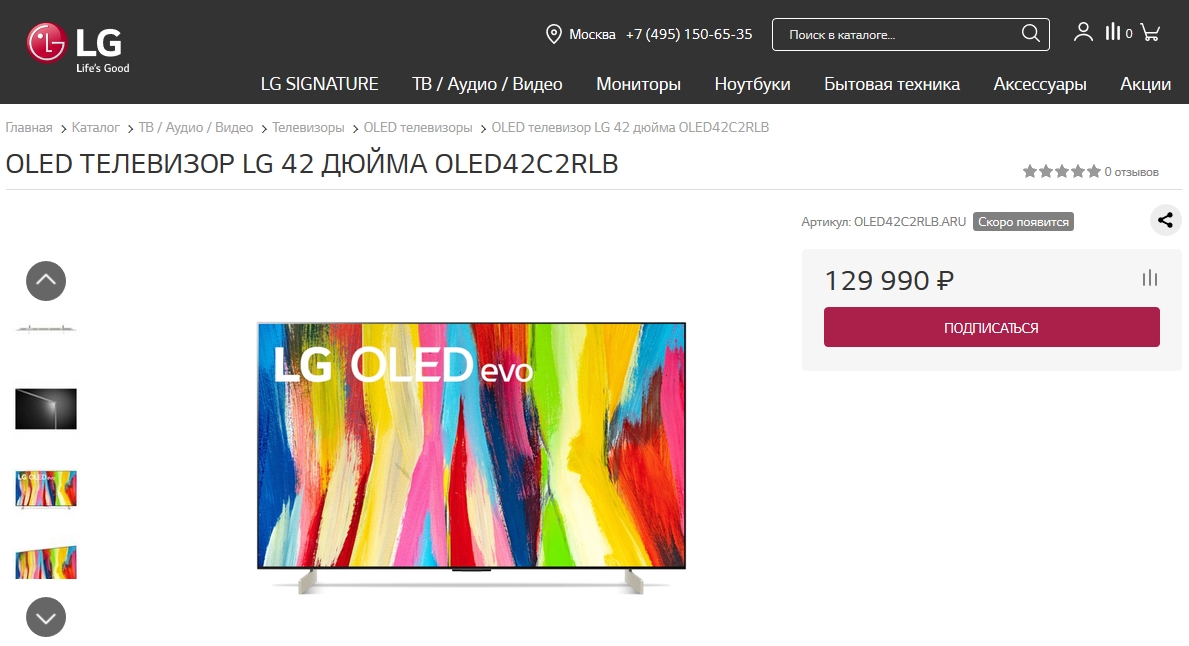 Из реальных предложений (именно LG OLED42C2RLB) самое дешёвое, из тех что я нашёл, – 135 990 ? Ну хоть не 159 990. Хотя, некоторым кажется, что "телик дешёвый слишком".