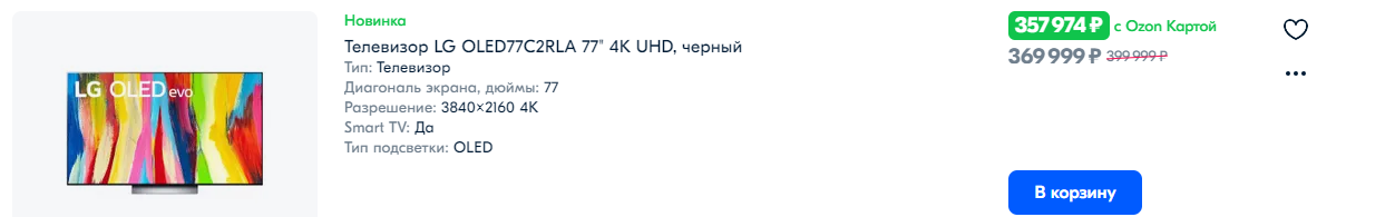 Если очень надо, то вот (идите на Озон, там несколько продавцов с такой ценой - завести их карту дело 5 минут)Chikago3000 писал(а):359 тыс. в LG Trade (OLED 77C2) - у них тоже Россия, официальный поставщик, сам мониторил их с 1 августа - долго были в наличии, но на данный момент всё раскупили.