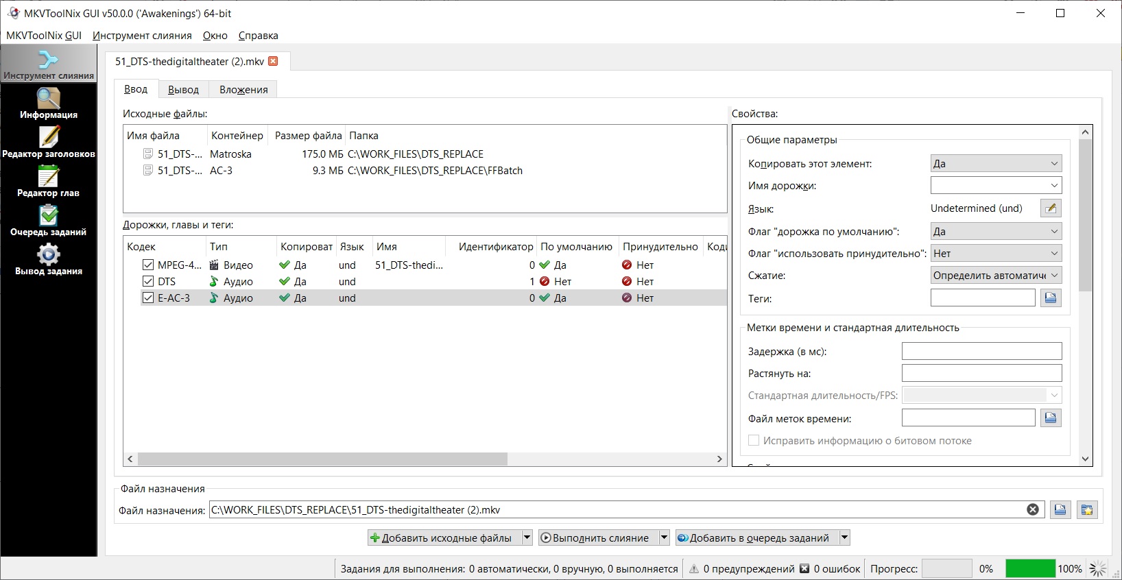 Все что осталось это добавить его к исходному файлу в MKVToolNix. Или заменить им DTS. Не забыть выставить потоком по по умолчанию