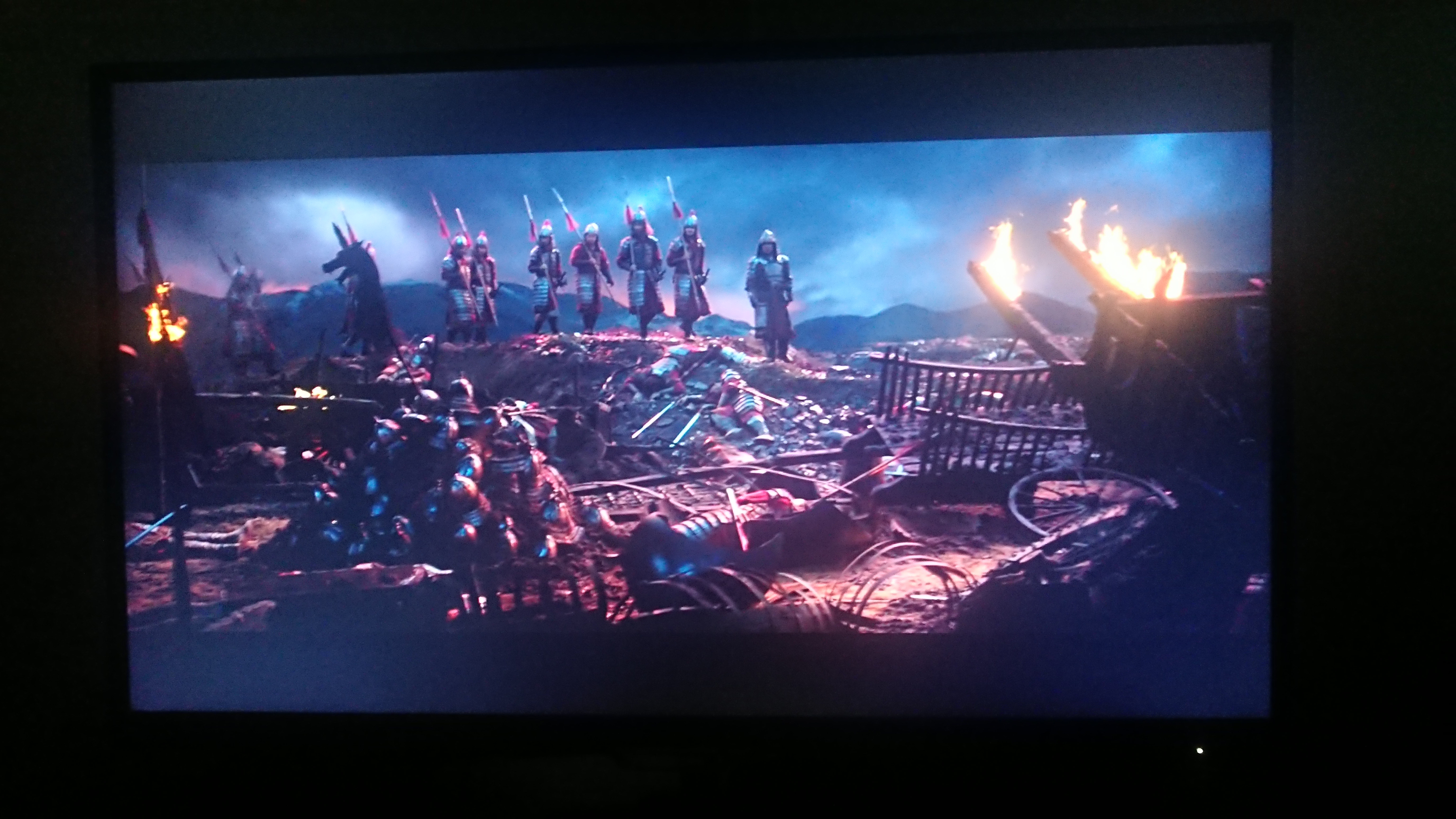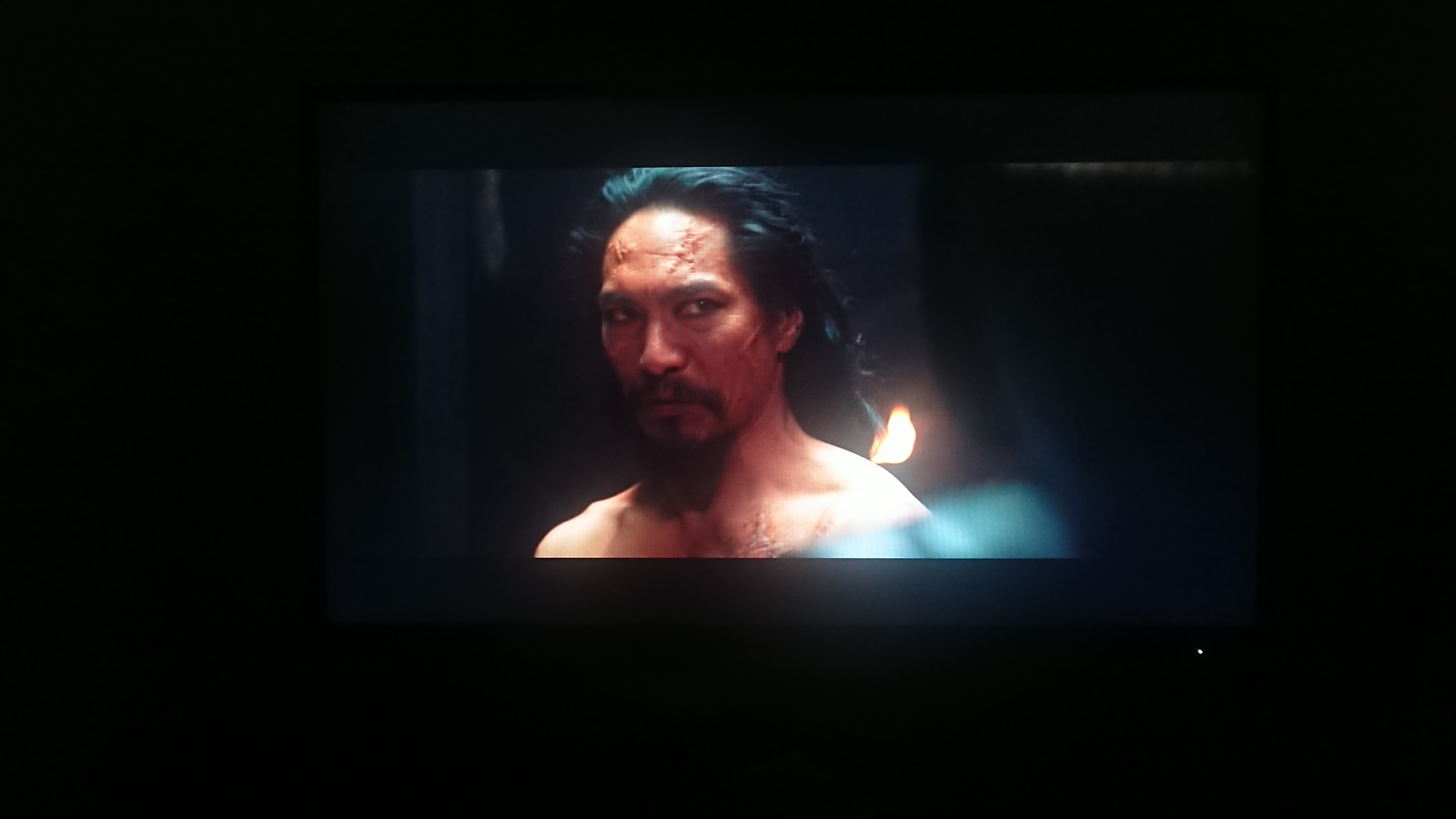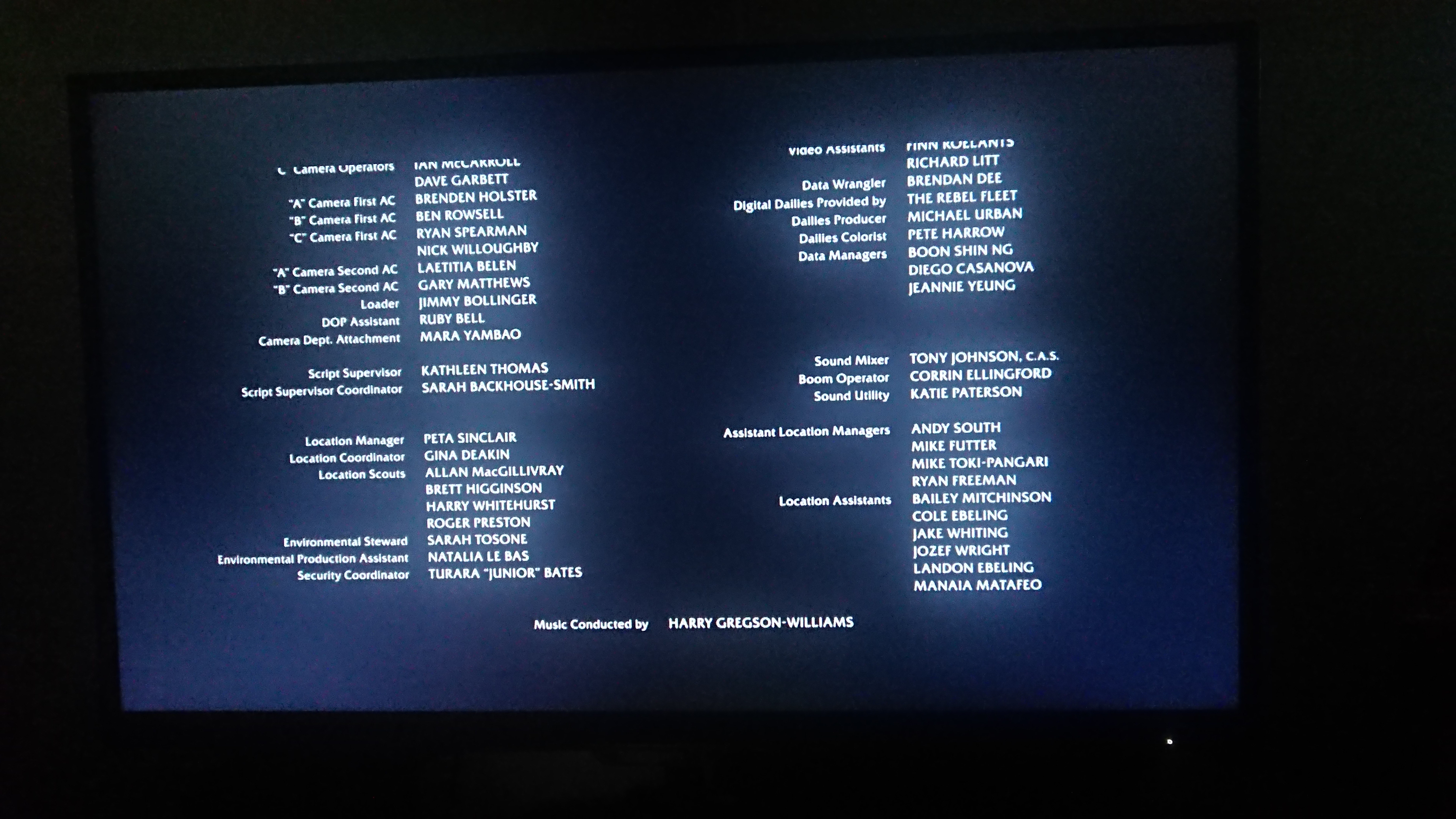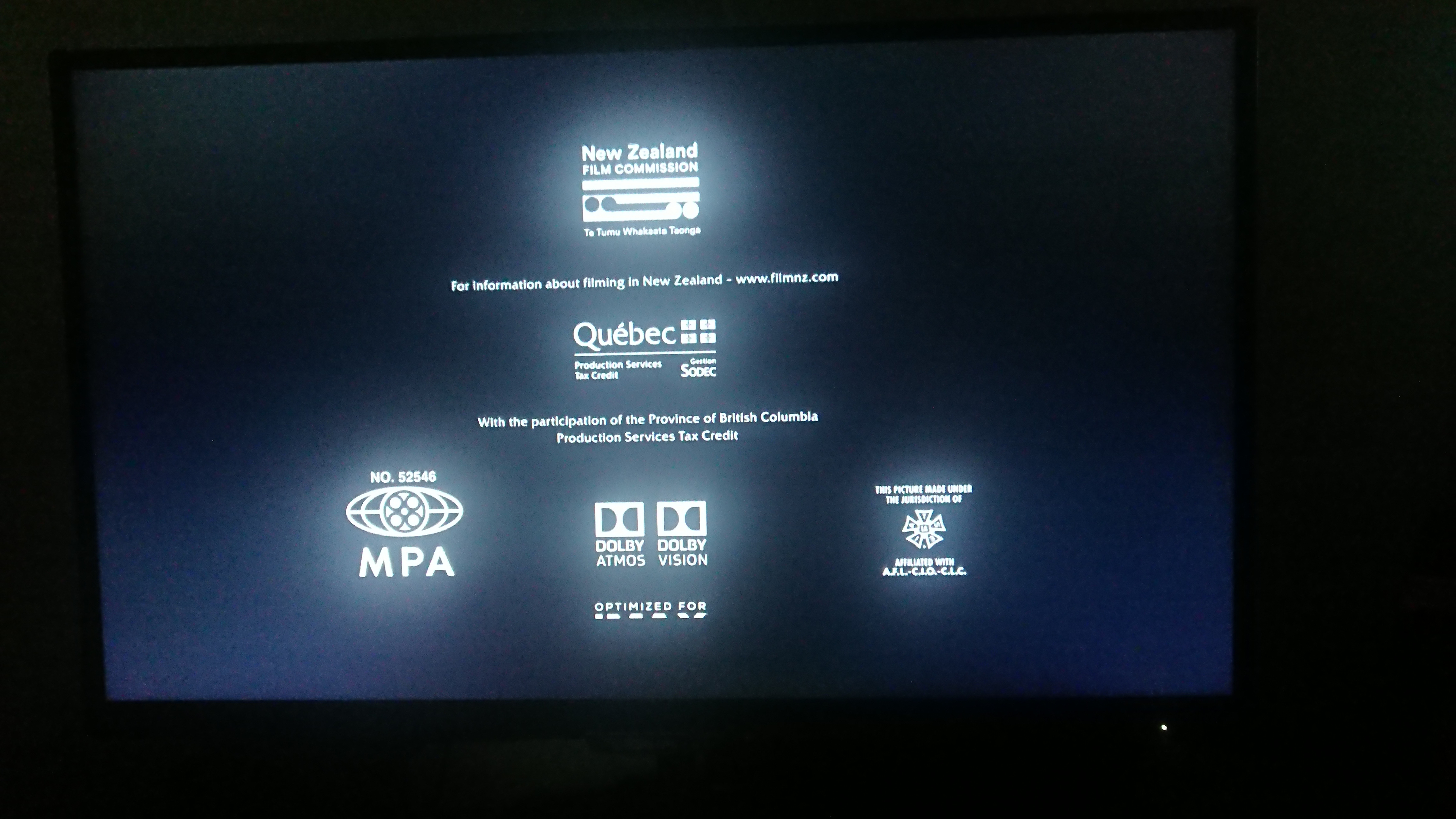 Титры на фото получились со светом вокруг, и по углам свет. На глаз это светлосерые буквы на чёрном - всё ровно.