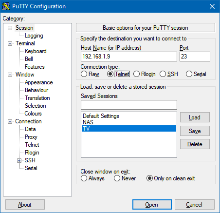putty. ТВ должен быть включен. После запуска putty вводите в поле Host Name IP адрес ТВ, порт 23, выбираете в выпадающем списке other (telnet), нажимаете open, откроется окно в котором нужно вводить команды согласно информации ниже.