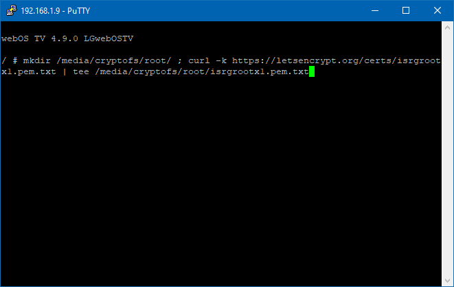 mkdir /media/cryptofs/root/ ; curl -k https://letsencrypt.org/certs/isrgrootx1.pem.txt | tee /media/cryptofs/root/isrgrootx1.pem.txt