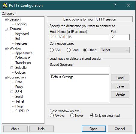 1) запустил putty, ввел: 192.168.0.105 (это IP моего телека), порт 23, other Telnet, нажал open (скрин 1)