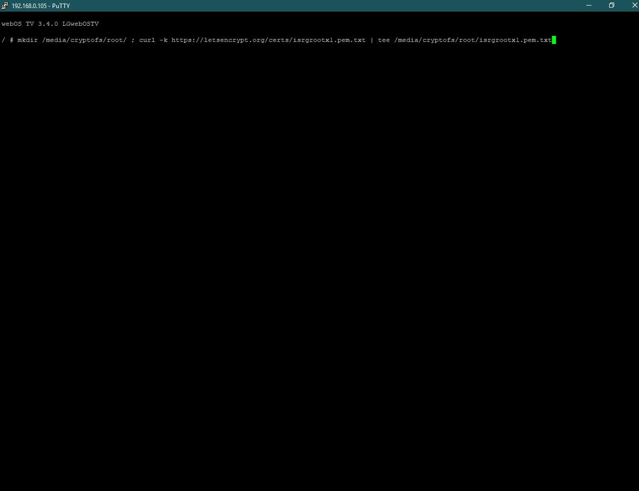 2) скопировал в буфер первую предлагаемую вставку mkdir /media/cryptofs/root/ ; curl -k https://letsencrypt.org/certs/isrgrootx1.pem.txt | tee /media/cryptofs/root/isrgrootx1.pem.txt, на зелёном прямоугольнике в putty нажал правую кнопку мыши и эта вставка впечаталась в putty (скрин 2), нажал enter и появилось как на (скрин 3)
