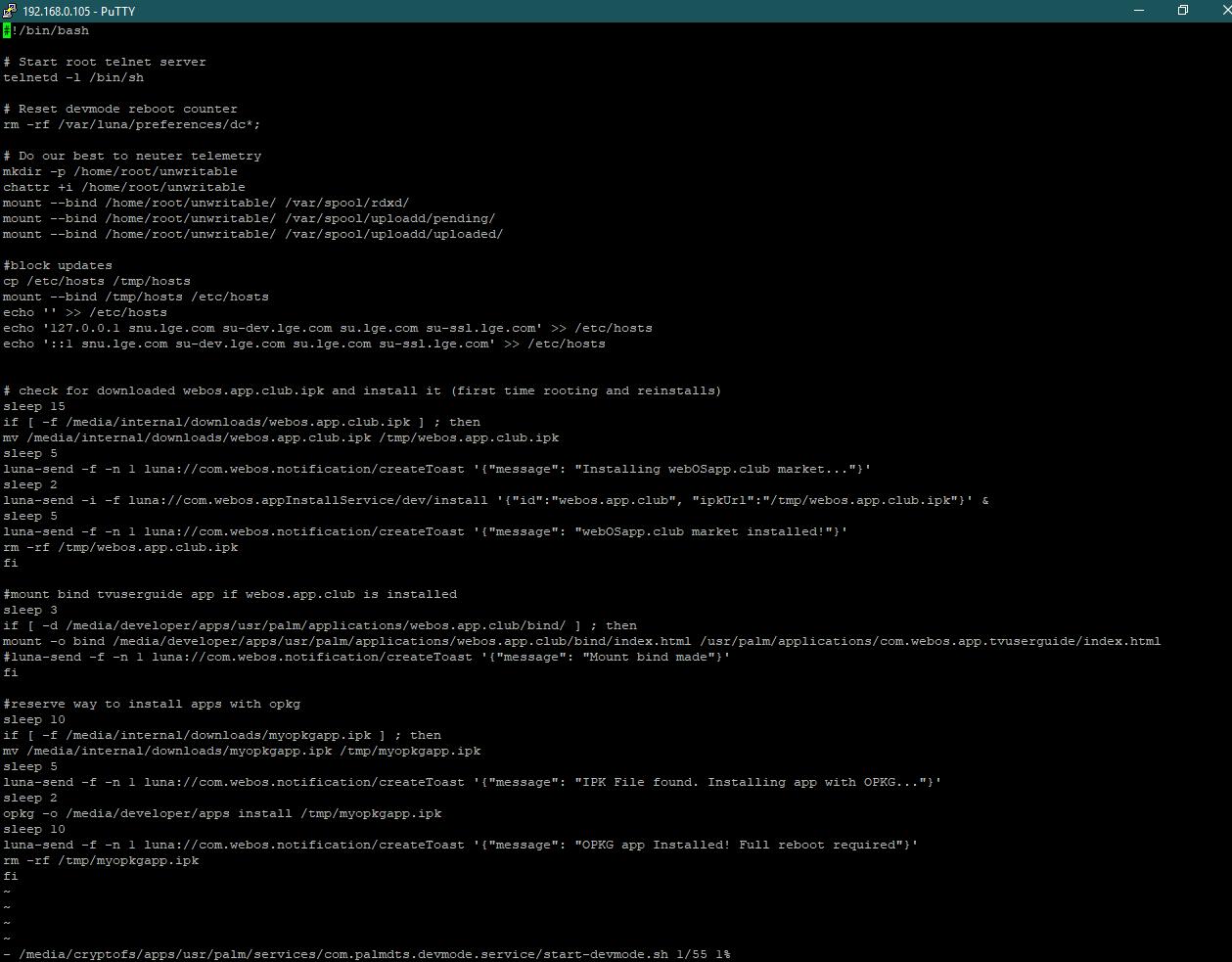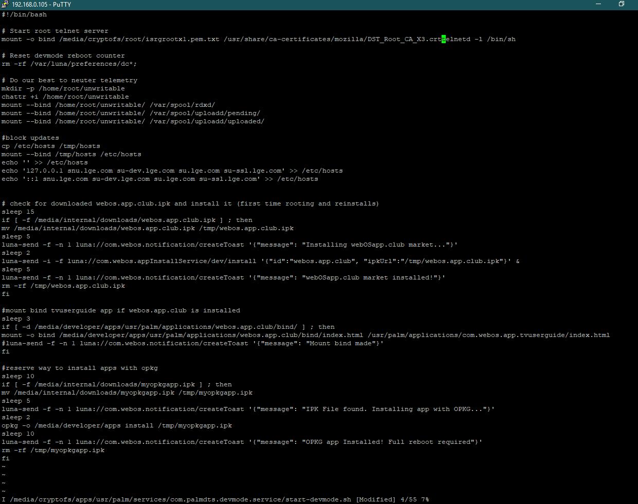 3) скопировал в буфер вторую предлагаемую вставку vi /media/cryptofs/apps/usr/palm/services/com.palmdts.devmode.service/start-devmode.sh, на зелёном прямоугольнике в putty нажал правую кнопку мыши и эта вставка впечаталась в putty (скрин 4), нажал enter и появилось как на (скрин 5)
