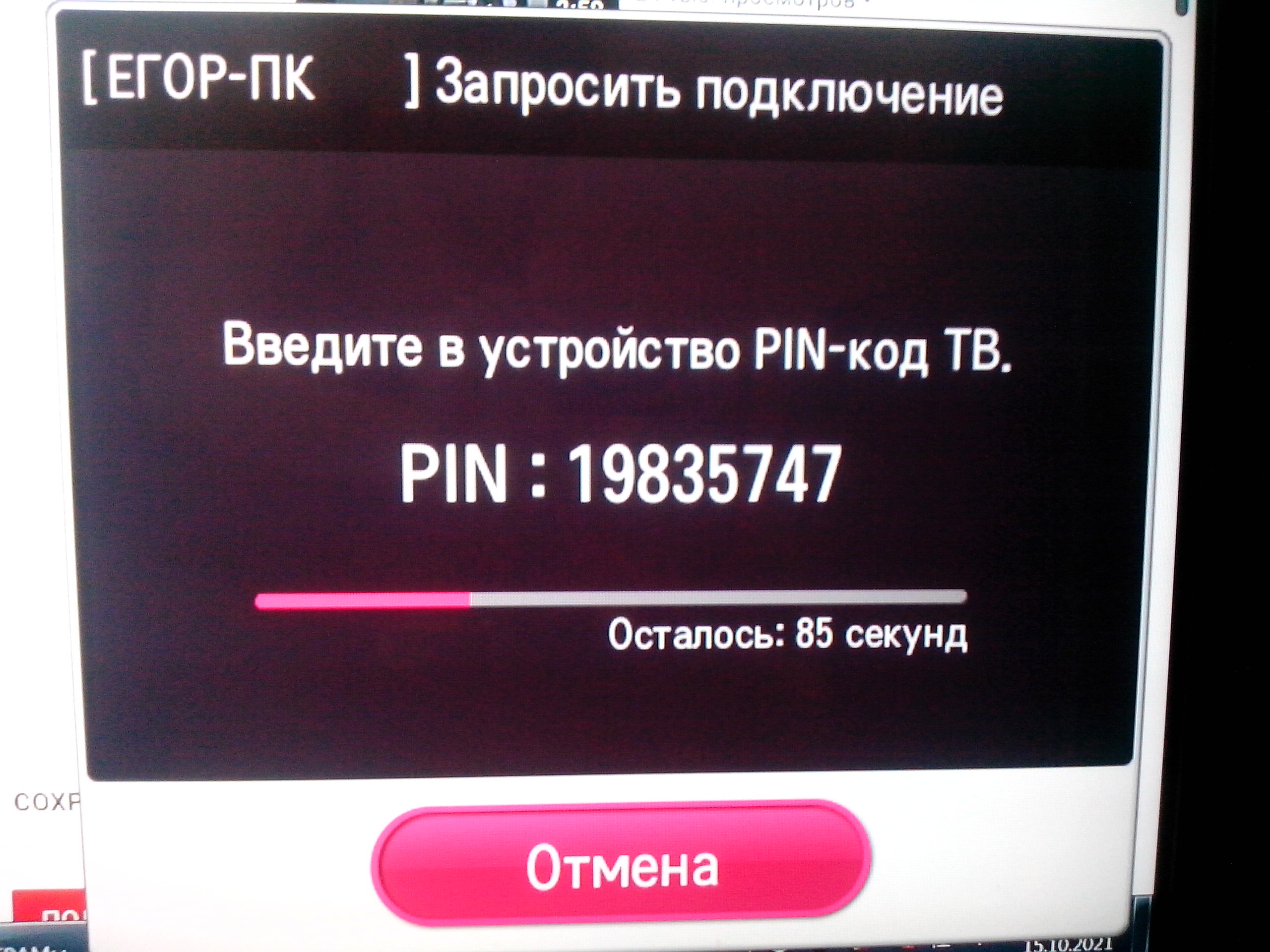 Здравствуйте, выскочило вот такое окно, я его не вызывал, каким образом оно могло появится я не понимаю!!! LG 47LA644V-ZA использую как монитор, ПК подключен к LG через HDMI-HDMI - Интернет LAN в Роутер из Роутера LAN в ПК, Роутер раздаёт интернет для других устройств, сеть запаролена.LG интернет мою сеть ловит через Wi-Fi, активирован. Имя моего ПК - Шохрат. Сижу в интернете (ютубе) и тут выскакивает вот такое окно, успел сфотографировать так как через 20 секунд оно исчезло хотя на таймере было 85 сек. (предполагаю что за 20 секунд то человек ввёл PIN и поэтому оно свернулось.) У меня вопрос, что это было? и главный вопрос каким образом? (Кто-то из соседей пытался активировать свой ПК "ЕГОР-ПК" в свой Телевизор, а мой LG каким то образом через Wi-Fi это случайно увидел? ) Не понимаю кто знает растолкуйте?