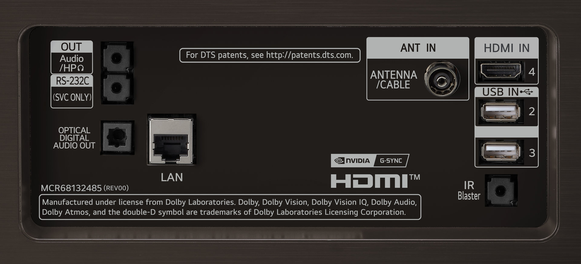 Задняя панель модели LG 48C4 оснащена следующими интерфейсами: один вход HDMI v.2.1a (с поддержкой режима 4К/120 Гц), 2 антенных входа (для спутникового и кабельного/эфирного ТВ), один порт LAN (со скоростью 100 Мбит/сек) и два порта USB (версии 2.0). Что касается аудио, то на этой же панели расположены оптический аудиовыход и выход 3,5" на наушники/акустику.