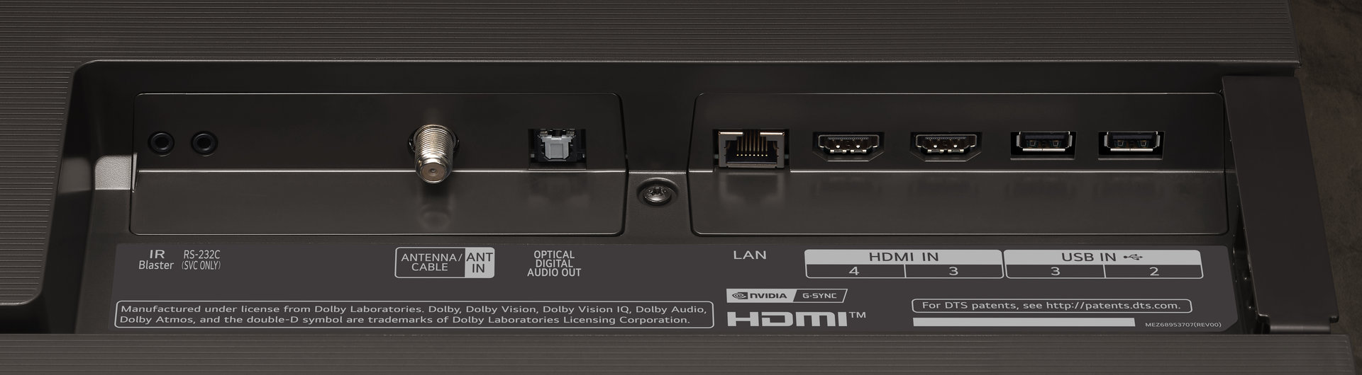 Нижняя панель модели LG 83C4 оснащена следующими интерфейсами: два входа HDMI v.2.1a (с поддержкой режима 4К/120 Гц), 2 антенных входа (для спутникового и кабельного/эфирного ТВ), один порт LAN (со скоростью 100 Мбит/сек), два порта USB (версии 3.0) и порт ИК-передатчика. Что касается аудио, то на этой же панели расположен только оптический аудиовыход.