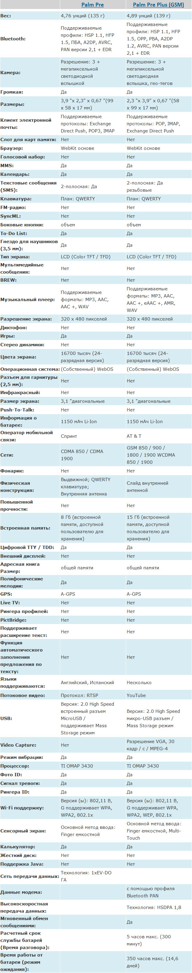 Обновление от 01.01.2011 - Полная таблица различий Palm Pre и Palm Pre Plus (маш. перевод с англ.)