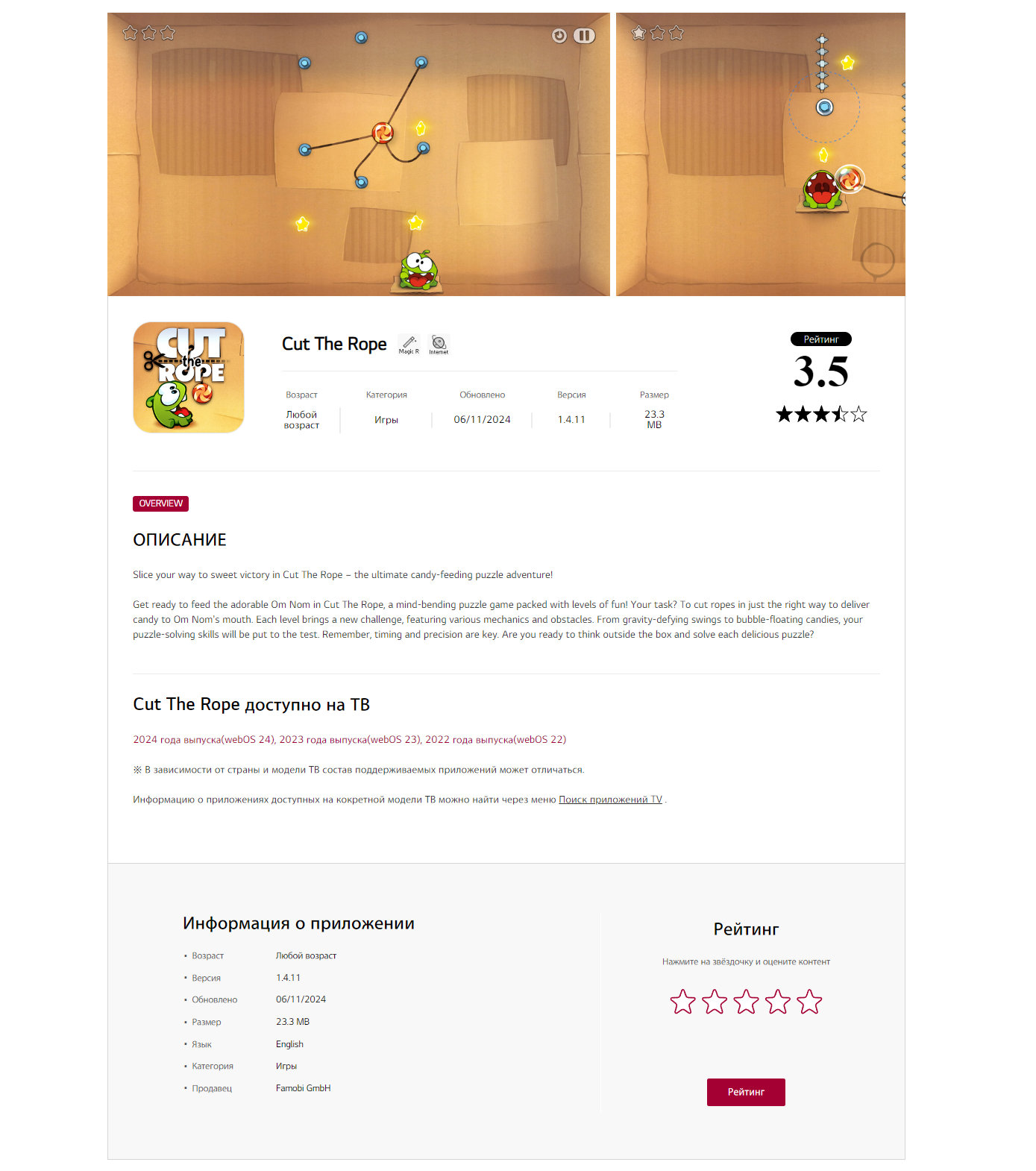 В рамках этого сотрудничества пользователи смарт-телевизоров на платформе webOS теперь могут сыграть в "Cut the rope" (*) - умопомрачительную игру-головоломку, полную веселья, используя пульт ДУ телевизора.
