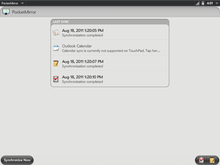 Компания Chapura выпустила новую версию программы PocketMirror, предназначенную для синхронизации данных стандартных приложений TouchPad с MS Outlook на настольном компьютере. Новая Chapura PocketMirror позволяет синхронизировать контакты, задачи и заметки. В ближайшее время ожидается добавление поддержки синхронизации календаря. Программа PocketMirror доступна в App Catalog.